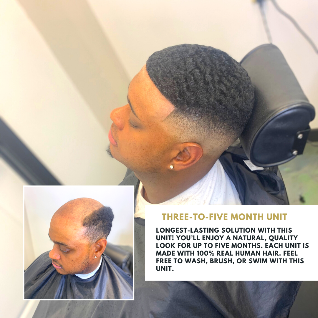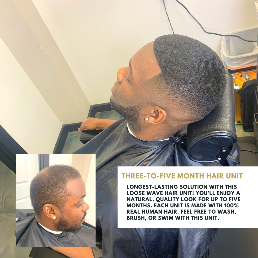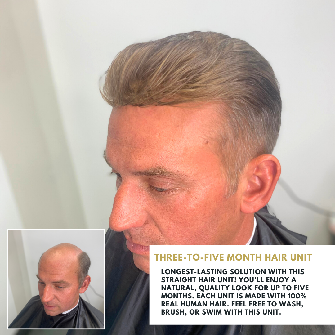 Hair Replacement Units are the fastest most guaranteed way to restore your hair and confidence. Hair systems are a rapidly growing solution to hair loss. They are commonly referred to as hair units, hair pieces, toupees, and man weave Our Hair Units are hand made and custom ordered to fit your desired hair style, texture, thickness, and color. It all starts with a free consultation with our hair replacement specialist. Once your hair loss is accessed a custom hair piece will be ordered. After a short two hour non-surgical and painless procedure you will regain a natural looking full head of hair.